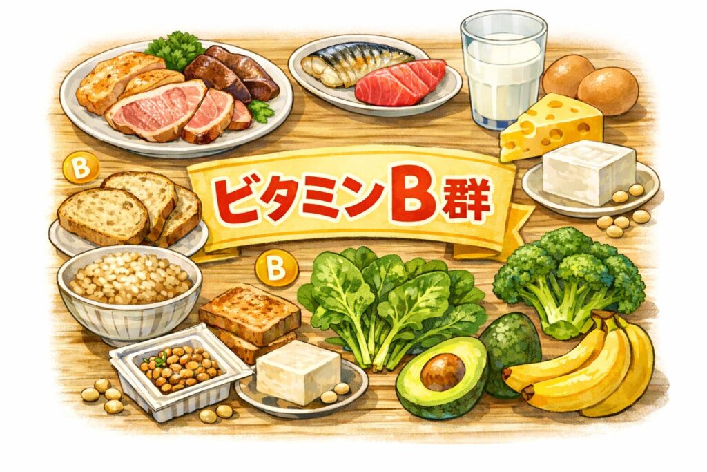ビタミンB群は水に溶けやすく体内に蓄えにくいため、毎日の食事でこまめに摂取することが大切です。